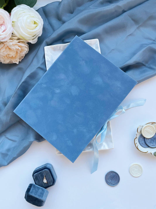 Dusty Blue Velvet Box for 5 x 7 Wedding Invitation, Gold Foil Monogram, Keepsake